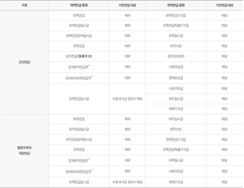 - 공무원연금, 사립학교교직원연금, 군인연금, 별정우체국연금 수급권자 및 그 배우자는 원칙적으로 기초연금 수급대상에서 제외